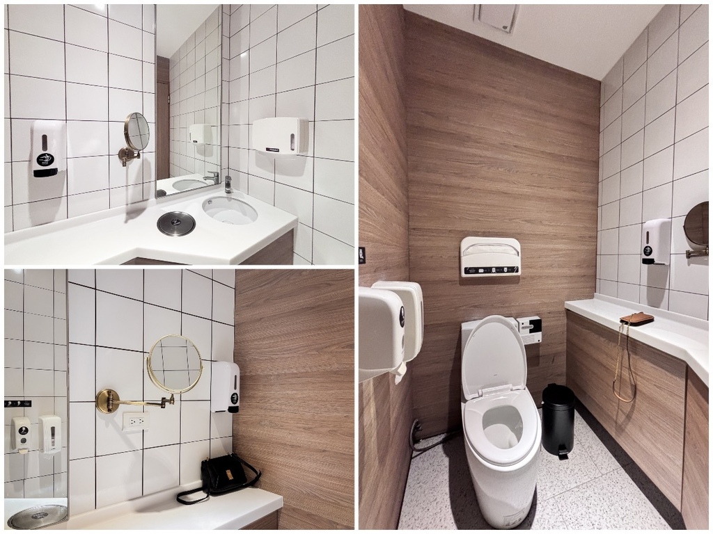 白色磁磚與暖色系的裝潢,裡面準備了如廁時需要的馬桶坐墊紙、擦手紙、酒精、洗手乳等等,